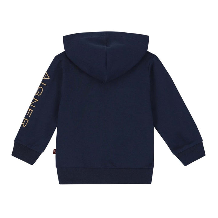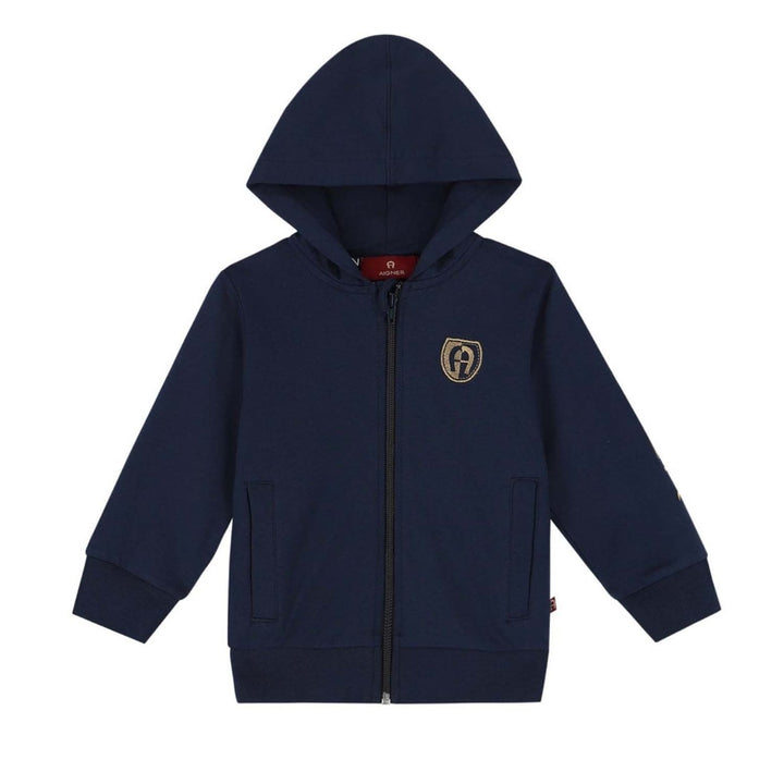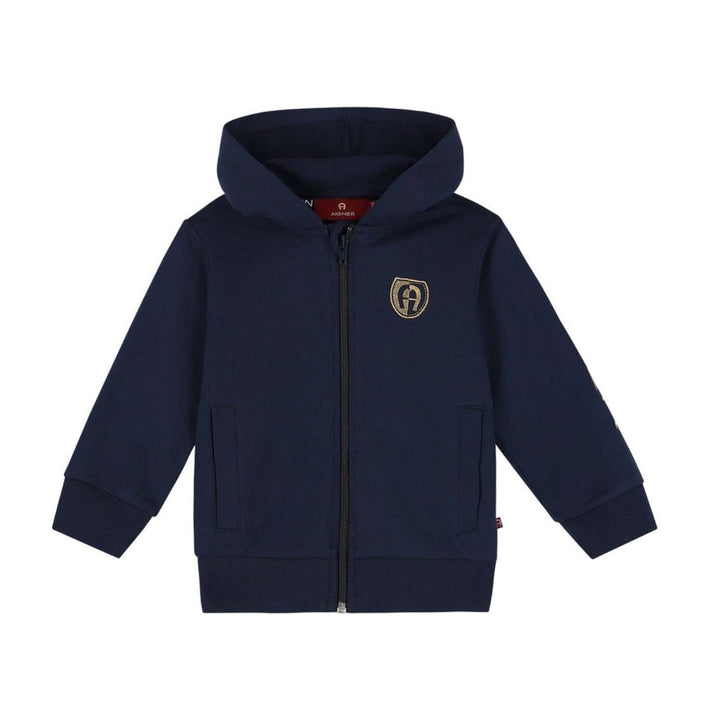 Navy logo zip up top for younger boys by Aigner Kids. Made from soft cotton, it features the brand's iconic horseshoe embroidered in gold on the chest and brand name on one sleeve. Hoodie neck and long sleeve with a ribbed cuff and hem and it has a front pocket. it fasten with a zip on the front.