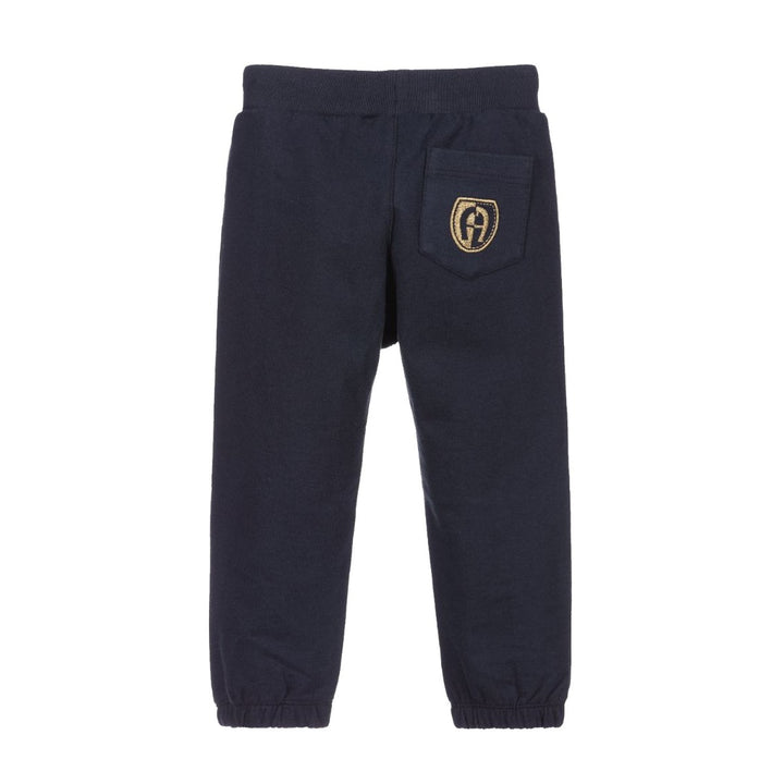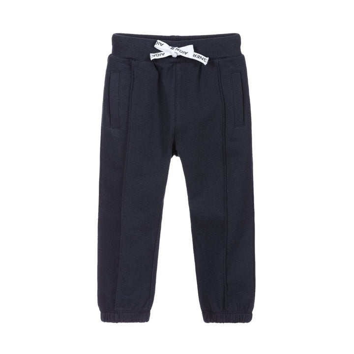 Navy blue joggers for baby boys by AIGNER. Made in comfortable cotton jersey, they have a useful elasticated drawstring waist, with branded ties and seam detailing on the front of each leg. There are two pockets on the front and one on the back, embroidered with the brand's signature gold 'A' horseshoe logo.
