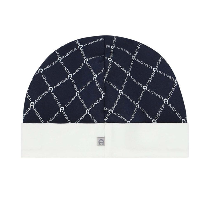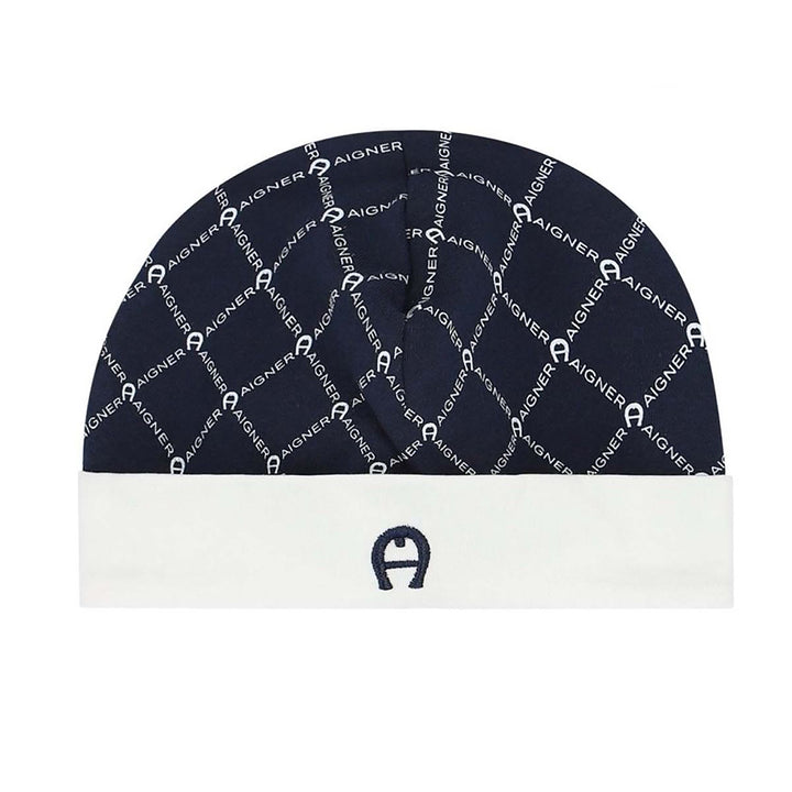 A blue Pima cotton jersey hat for baby boys by AIGNER. Printed with an all-over navy blue logo pattern, the navy blue turned-up brim has the brand's white signature 'A' horseshoe logo embroidered on the front.