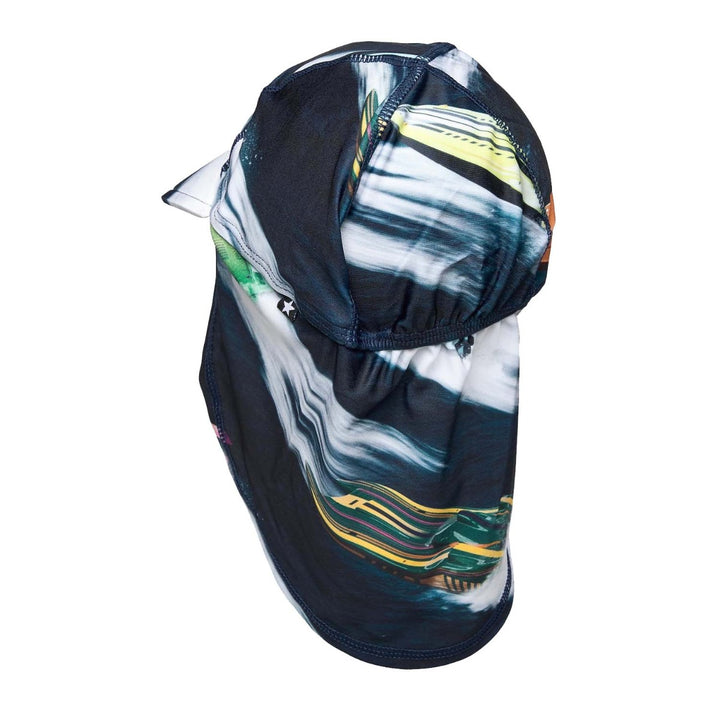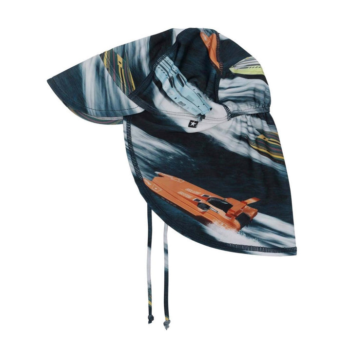 Sun hat with 50+ UV protection, a wide brim and longer at the back for protection from the sun. The sun hat has a lovely print of a speedboat that's tearing through the water. This Molo product is recycled and made from REPREVE reusable polyester. REPREVE is the leading, most trusted brand in reusable fibres and is made from used plastic bottles and other waste. The production of recycled polyester utilises far fewer resources and emits less CO2, making Molo’s recycled swimwear a sustainable choice.