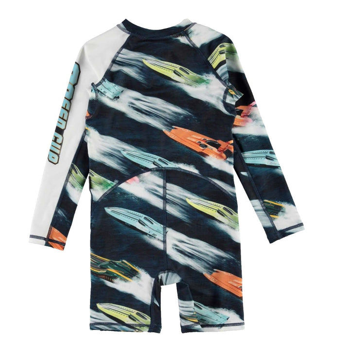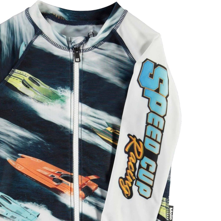 Navy blue sun protective suit for boys, by Molo. Made from Repreve® recycled polyester, it has a colourful speed boats print all-over with crashing waves, and a zip-up fastening on the front.