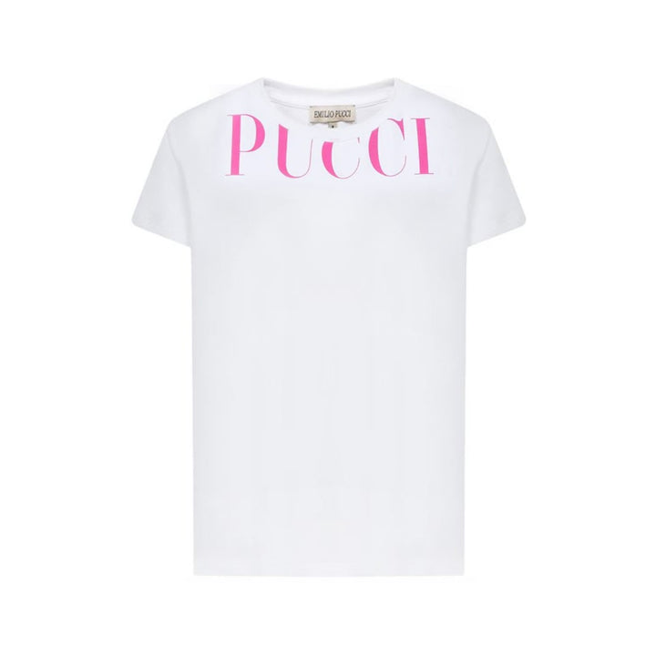 White cotton-blend TEEN logo-print T-shirt from EMILIO PUCCI JUNIOR featuring a crew neck with welt finishing, short sleeves, a central printed logo and a straight hem.