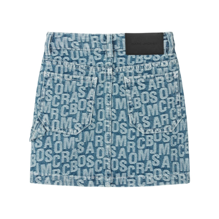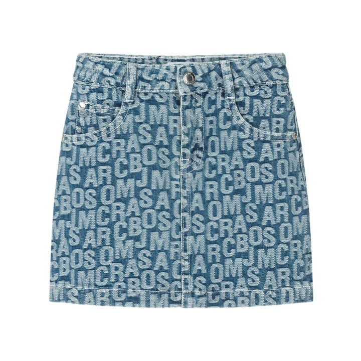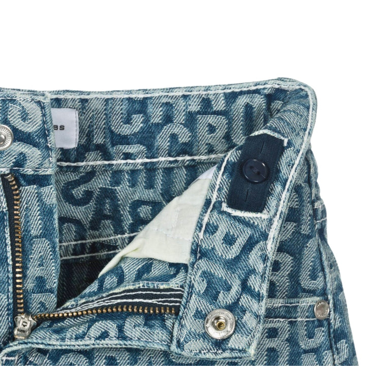 Mid-blue Mini-me jacquard denim skirt for girls by American brand MARC JACOBS. For a distinctive look, it is patterned in the designer's Jumbled logo, with a black rubberised logo patch on the back. Made in non-stretch cotton denim, this five-pocket style fastens on the front with a zip and branded popper, and has an adjustable waist for an ideal fit.