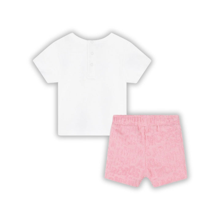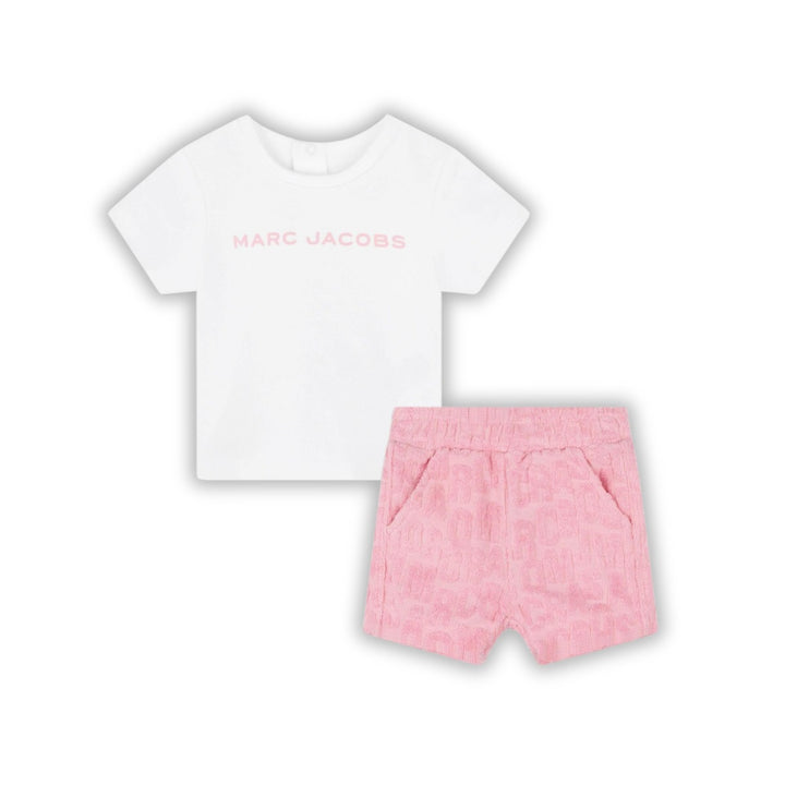 A white and pink shorts set for baby girls by MARC JACOBS, made in soft cotton jersey. Ideal for warmer days, the short-sleeved white T-shirt has a bright yellow logo motif on the front and useful popper fastenings on the back. To complete the signature look, the shorts are patterned with a Jumbled logo design and have a gently elasticated waistband.