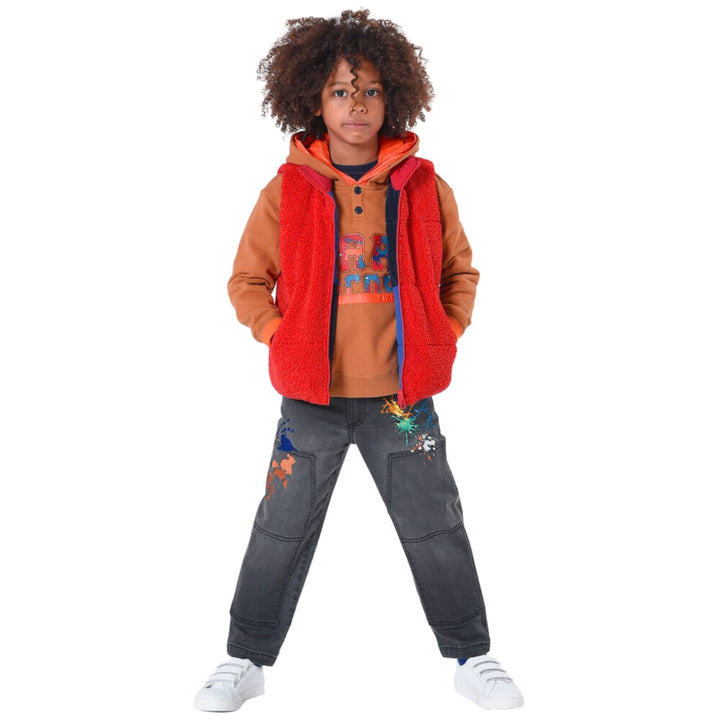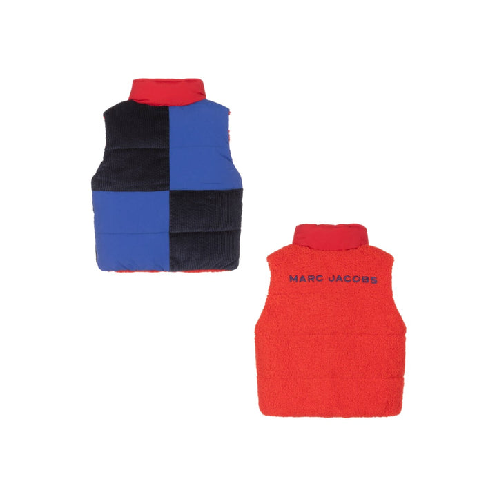 A blue and red reversible gilet for boys from MARC JACOBS, with puffer-style quilting. The blue side is panelled in silky fabric and soft cotton corduroy and detailed with a red embroidered monogram on the chest. Made in fluffy teddy fleece, the red side has a blue embroidered logo across the back for a colour-coordinated look. This cool sleeveless jacket has mid-weight padding for cosiness and fleece-lined pockets on both sides to help keep little hands warm.
