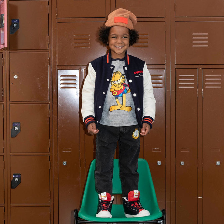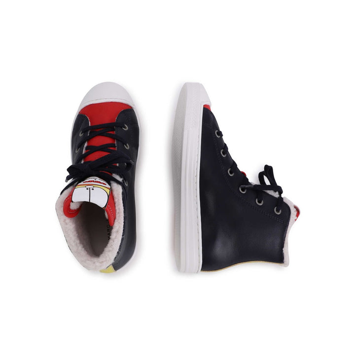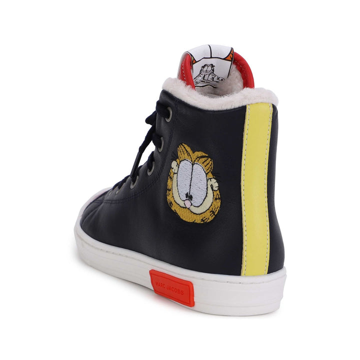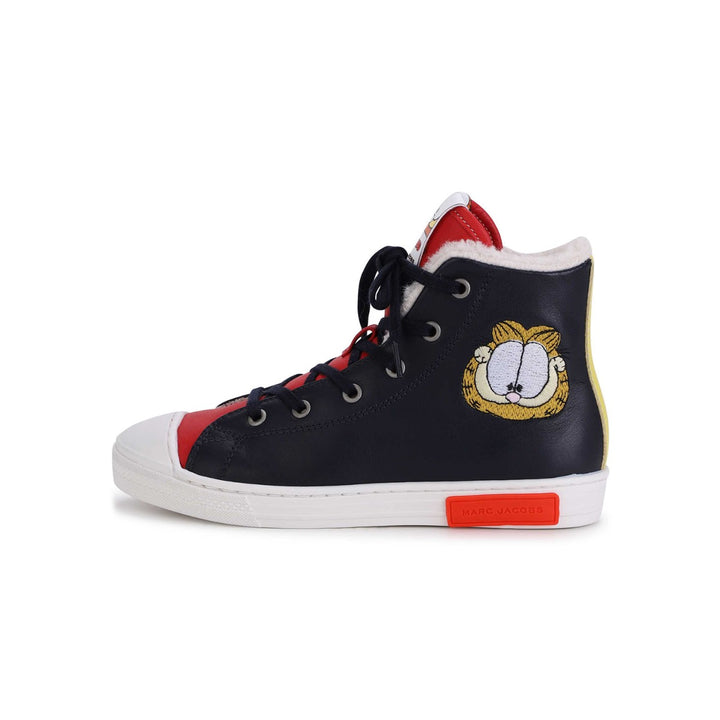 Fun navy blue and red leather high top trainers for boys by MARC JACOBS, in collaboration with Garfield™. They have a warm, cosy faux shearling lining and textile insoles. Fastening with navy blue laces, they have a Garfield™ label on the tongue and a cool embroidered Garfield™ on one side. There is a yellow leather trim on the back of the heel and a red rubber logo patch on the side of the chunky white non-slip rubber outer sole.
