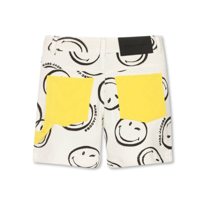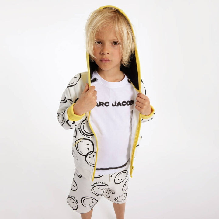 Playful ivory organic cotton shorts for boys by American designer MARC JACOBS. It is patterned with winking smiley faces. They have two front pockets and useful, bright yellow patch pockets on the back with a carpenter-style, hammer loop. Made in super comfortable, sweatshirt jersey, they have an adjustable waistband for a great fit, with belt loops and a rubberised black logo patch. They fasten with a black logo popper and yellow zip.