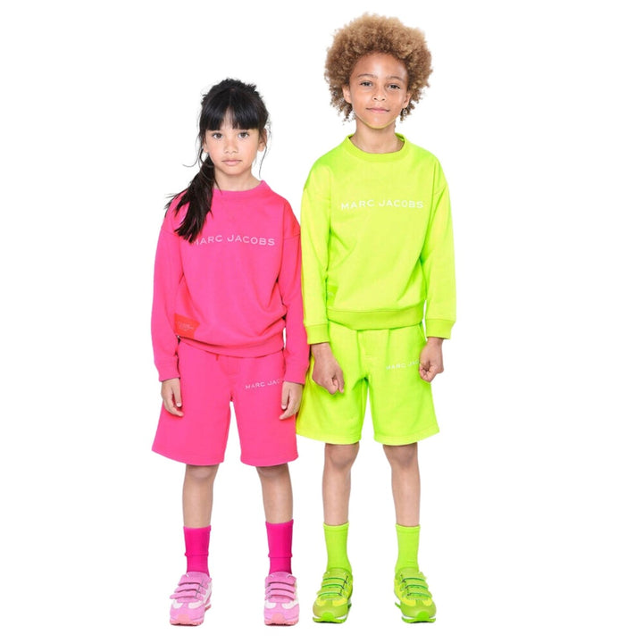 Mini-me fuschia pink shorts for boys and girls by MARC JACOBS. Made in soft cotton jersey, these comfortable shorts have pockets and a drawstring waistband for a casual streetwear style. There is a tonal logo motif on the front and a box logo print on the back pocket.