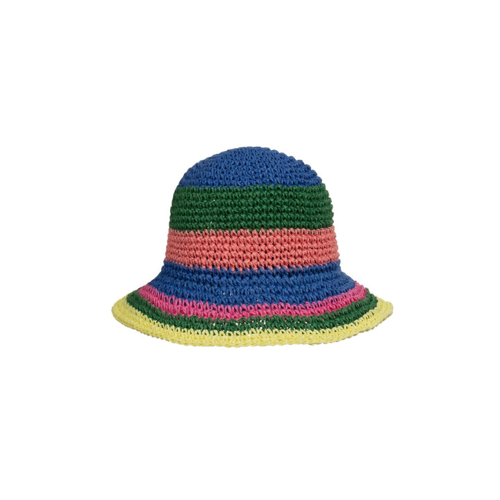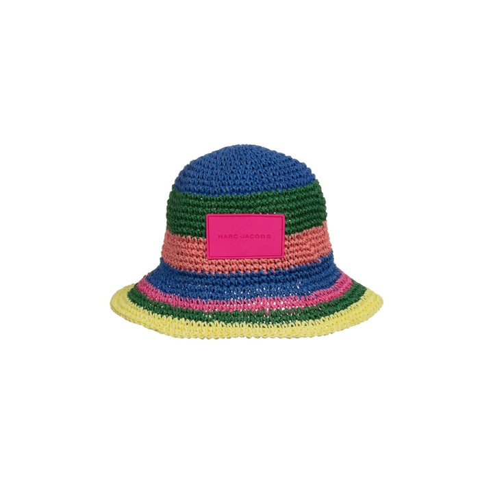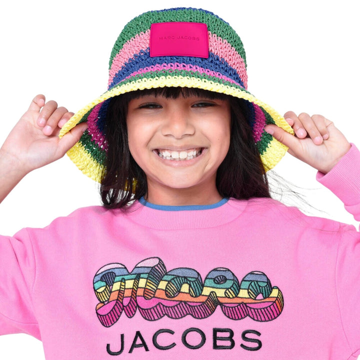 Just right for summer days, a loosely woven straw hat for girls by American brand MARC JACOBS, striped in blue, green and pink, with a yellow brim. It has a bright pink rubberised logo patch on the front.