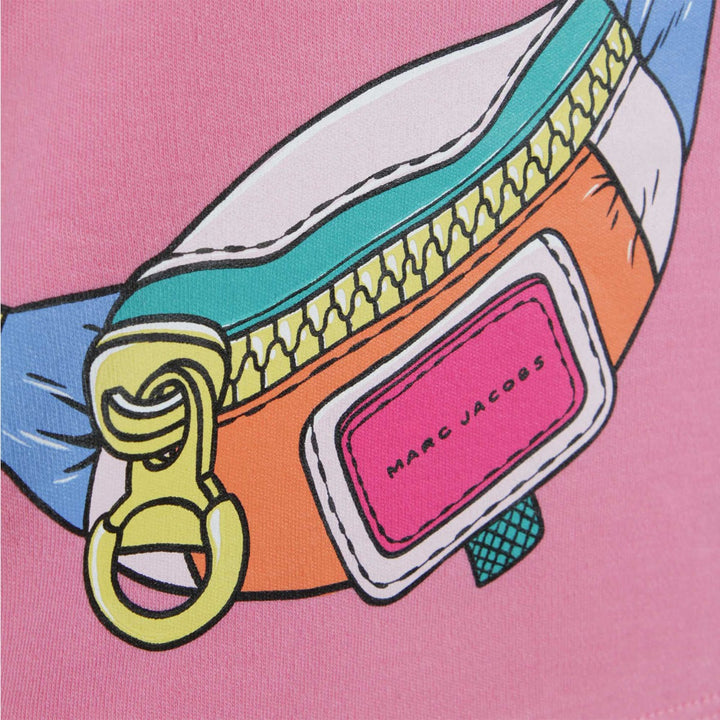 Cute pink and white shorts set for little girls by MARC JACOBS, made in soft and stretchy cotton jersey. The pink T-shirt has a colourful trompe l'oeil belt bag print on the front and popper fastenings on the back for easy dressing. The white shorts have a comfortable elasticated waistband, with a colourful coral print, yellow trims and a pink logo on the front.