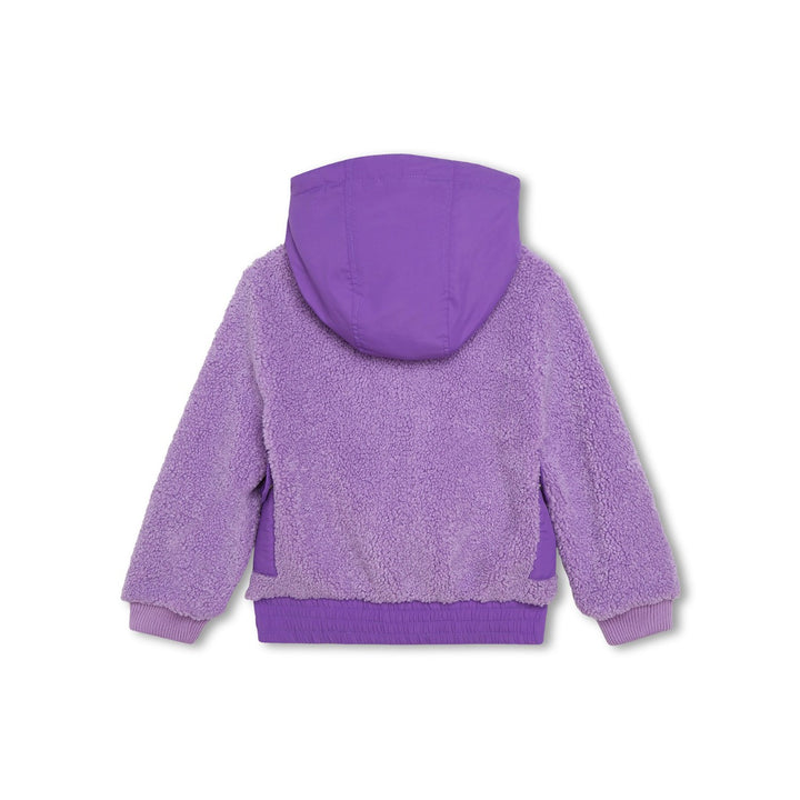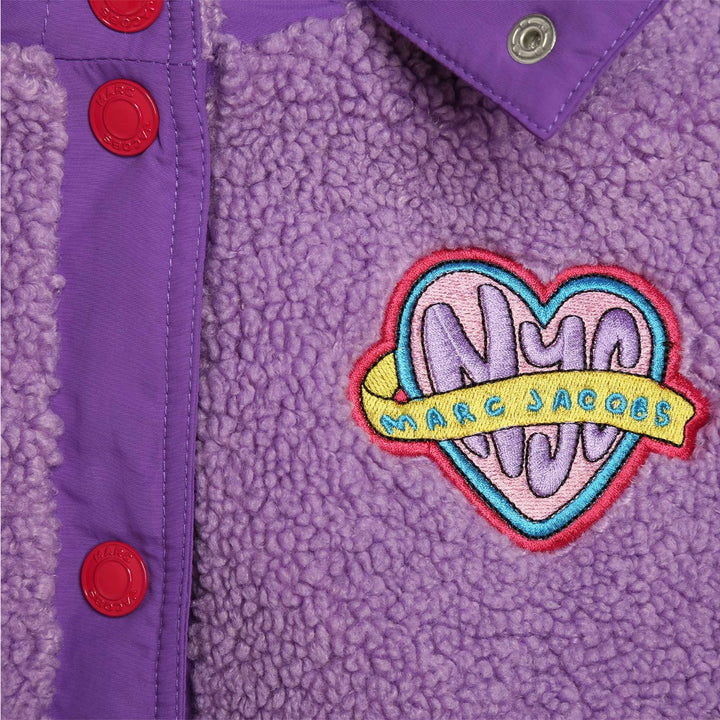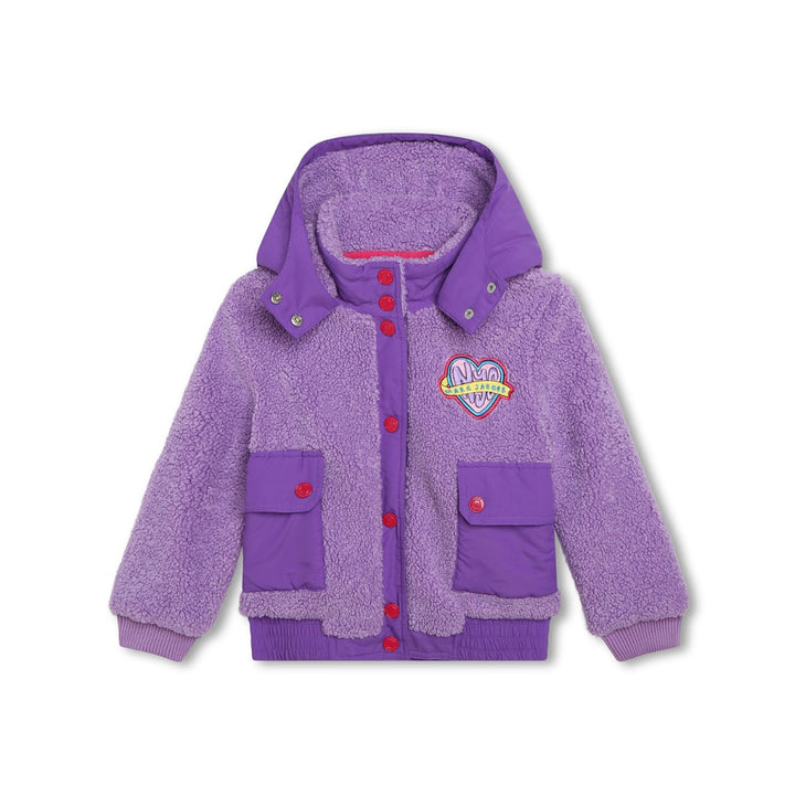 faux-shearling hooded jacket from Marc Jacobs Kids featuring violet purple, faux-shearling design, contrasting trim, logo patch at the chest, classic hood, front press-stud fastening, long sleeves, elasticated cuffs, front flap pockets and elasticated hem.