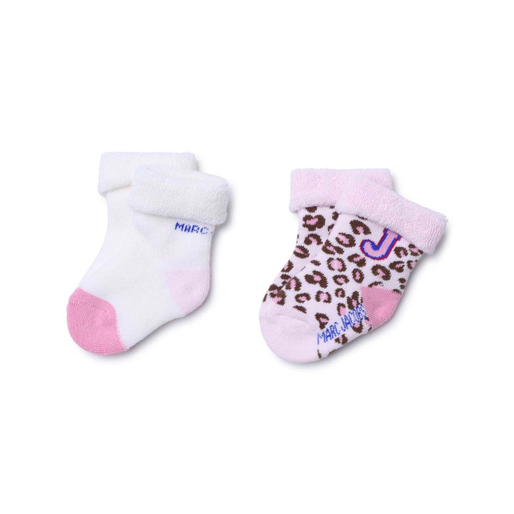 Adorable two pack of Pink socks for Baby girls by MARC JACOBS, knitted from soft loopback cotton jersey. The pale blue pair have a logo knit on the sides, with yellow and blue trims. The striped pair have matching rims and an all-over logo letter pattern.
