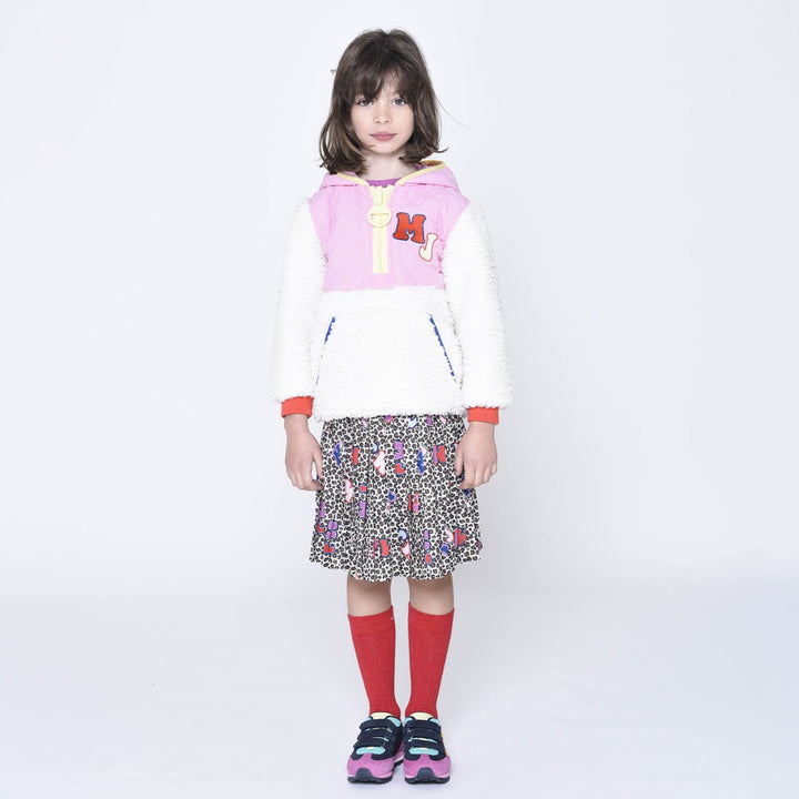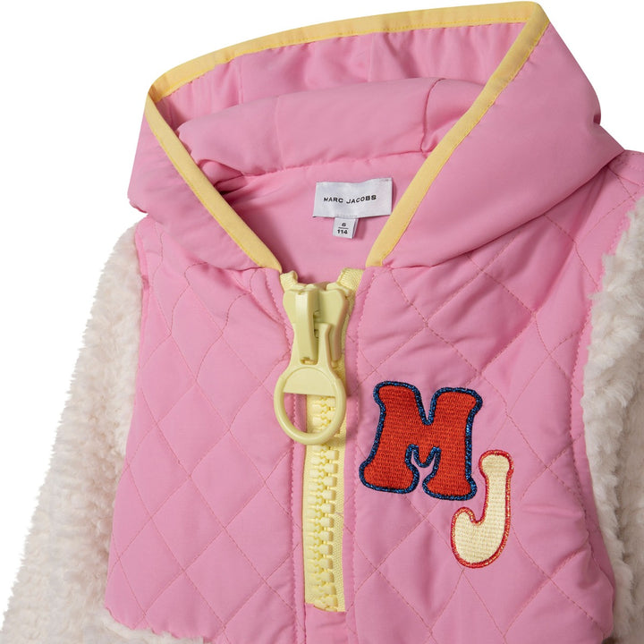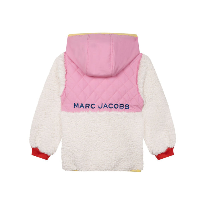 Girls ivory and pink Hoodie by MARC JACOBS. The white borg fleece is soft and fluffy and there is contrast pink quilted details at the chest with MJ logo embroidery. The top fastens with an oversized yellow zip and there are side pockets with blue trims, red wrist cuffs and logo embroidery on the back.