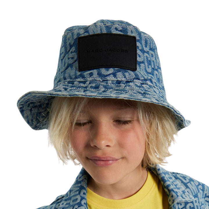 A cool blue bucket hat for boys and girls by MARC JACOBS. Casual and easy to wear, it has a jacquard Jumbled logo design and a black rubberised patch on the front for an iconic branded look. Made from cotton denim, it has lightweight chambray lining for extra comfort.