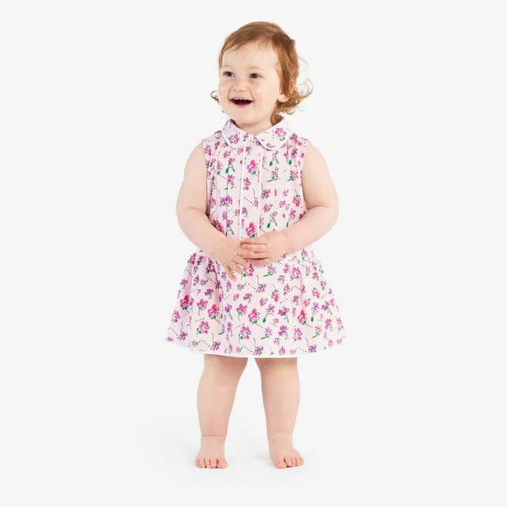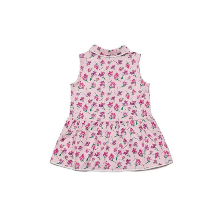 Sleeveless dress with jersey collar. Made of 100% cotton with Pink Flowers allover graphics. Front button closure. A colorful summer garment perfect for even the most special occasions.