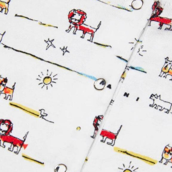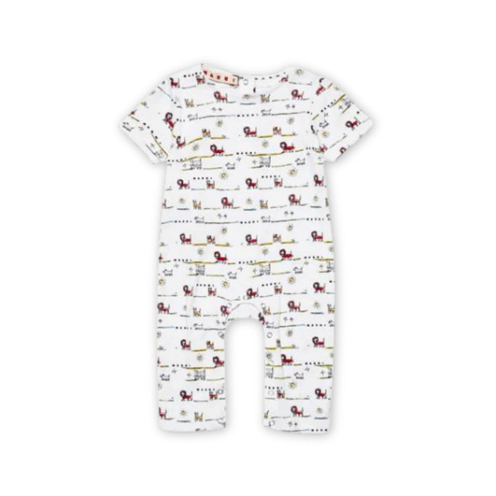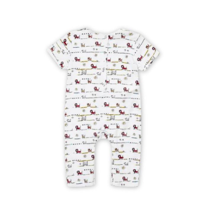 Short-sleeved jersey romper with animal-themed allover graphics. Convenient button closure on the shoulder and crotch.