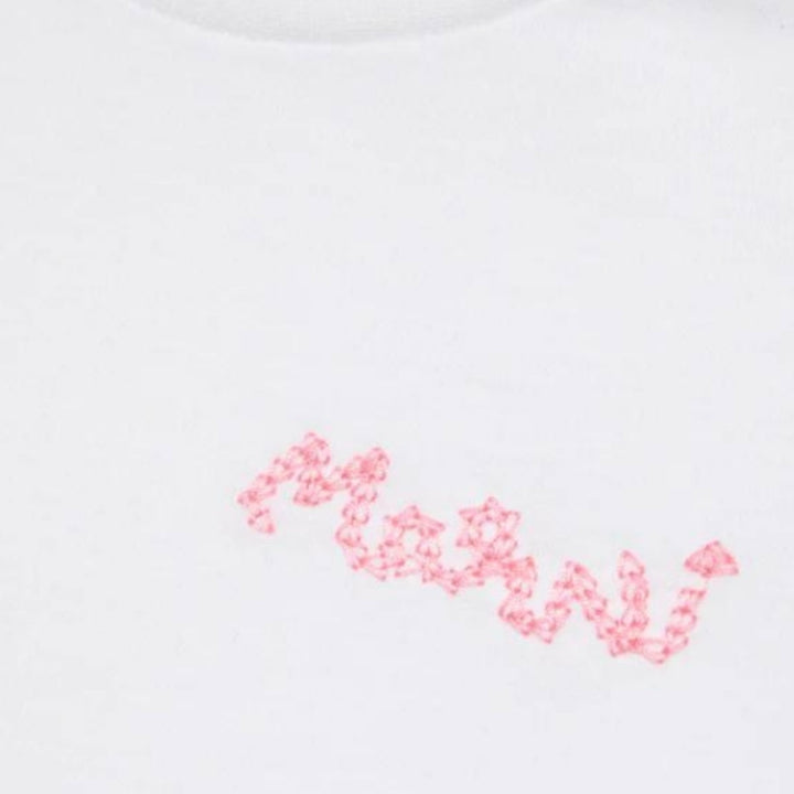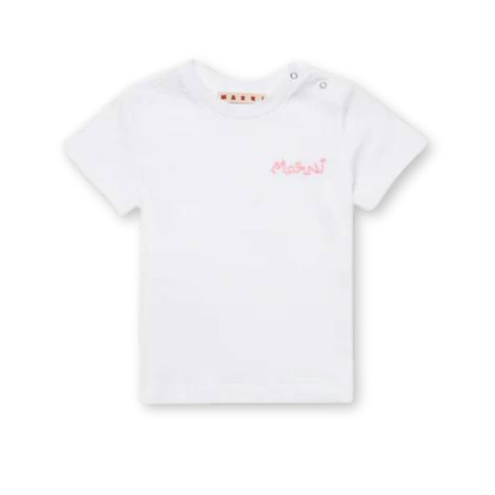 Short-sleeved crew-neck T-shirt in jersey. Featuring a heart-side Marni chain stitch logo on the front. Practical button closure on the shoulder. Made of 100% cotton. A simple and versatile garment: suitable for both everyday life and big occasions.