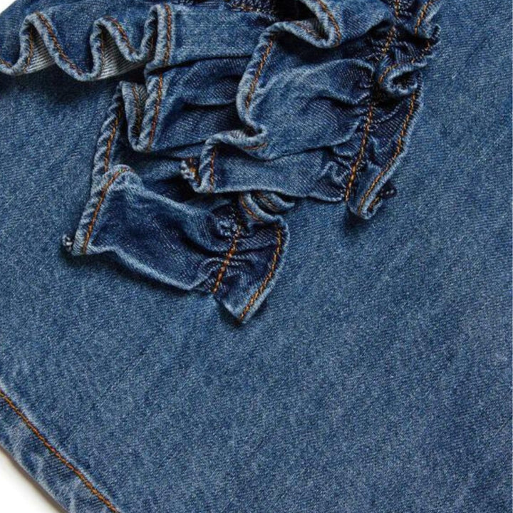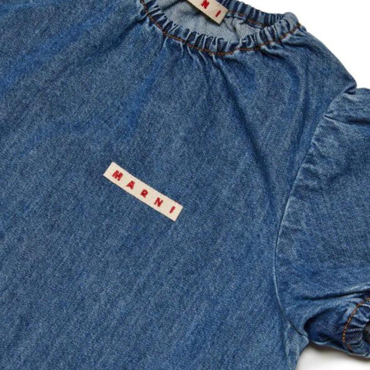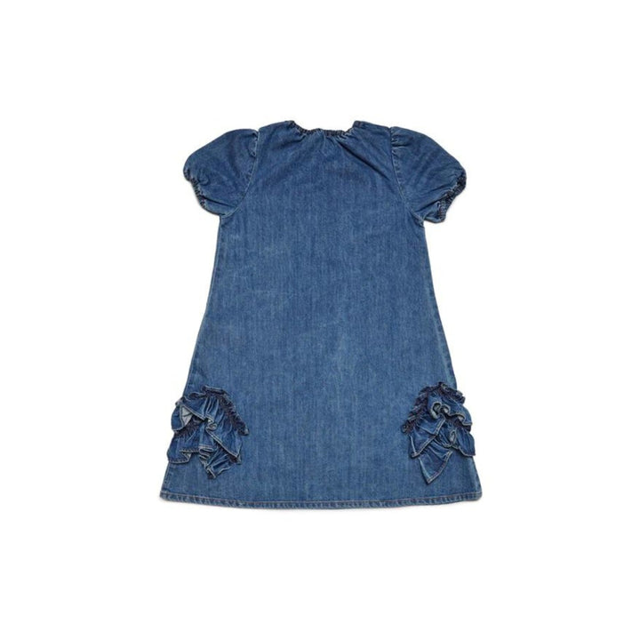Denim short-sleeved dress with ruffles on the sides. Made of 100% cotton with contrasting color stitching. Featuring an institutional logo patch on the front heart side. An easy-to-wear casual option.
