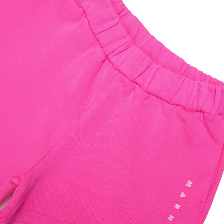 logo-print track shorts from MARNI KIDS featuring hot pink, cotton, logo print at the leg, elasticated waistband, two side inset pockets and straight leg.