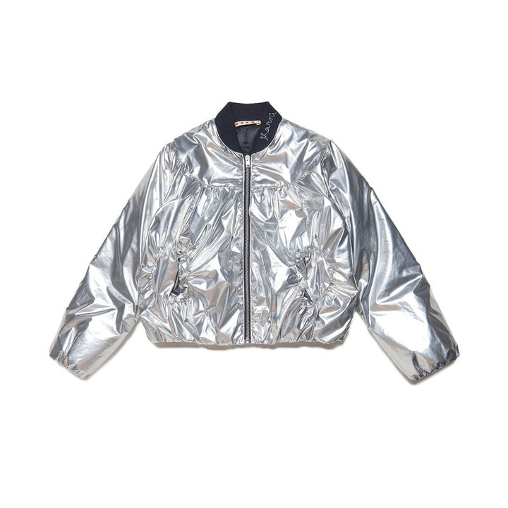 Long-sleeved, silver-effect nylon bomber jacket. It features original pockets on the front, contrasting inner lining and cursive Marni logo embroidered on the collar.
