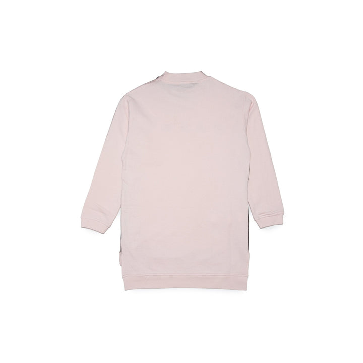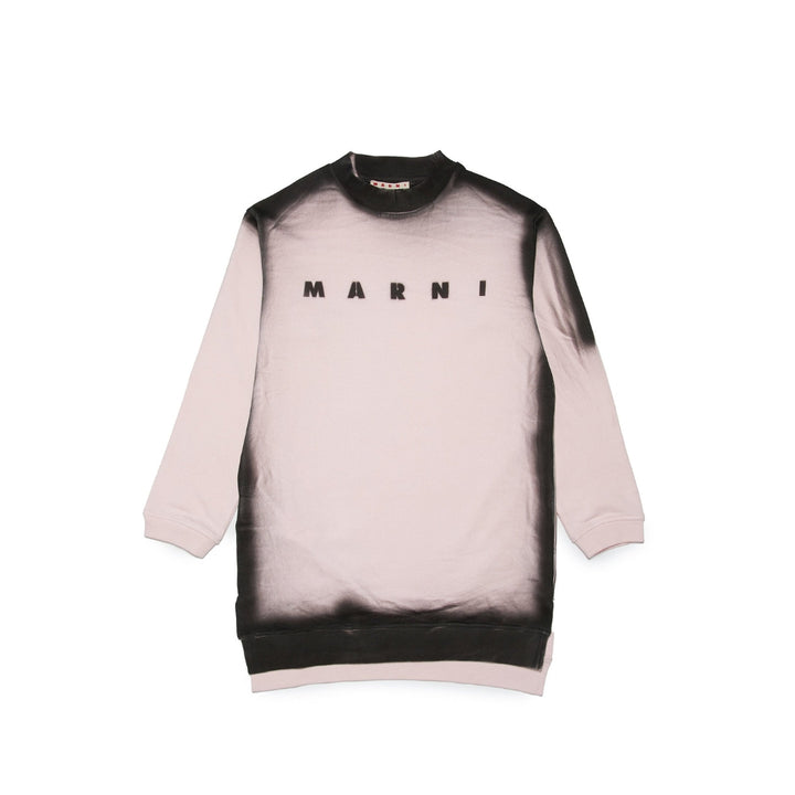 Pink long-sleeve cotton fleece dress with contrasting color spray effect on the front part, ribbed cuffs and hem and contrasting color Marni logo.