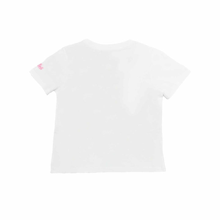 Girl white t-shirt with pink Saint Barth front print and multicolor decorations.\