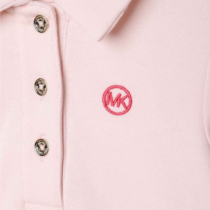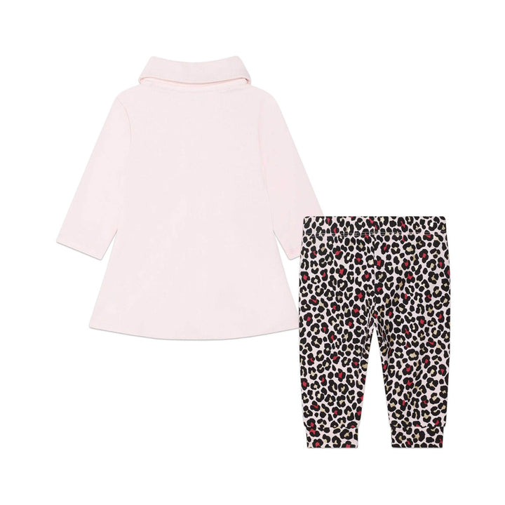 Light pink trouser set for little girls by Michael Kors Kids, made from soft cotton jersey. The long-sleeved tunic top has a polo collar, a three-button placket and gold MK logo embroidery on the chest. It is paired with comfortable trousers in a red and glittery gold animal print. Both items come in a lovely gift box. The main fabric of this garment contains cotton from organic farming.