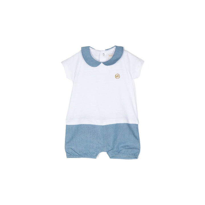 Sweet white and blue shortie for baby boys & girls from Michael Kors, made in soft cotton to be comfortable against delicate skin. Designed to look like a white jersey top and chambray shorts, it has easy-to-use popper fastenings on the back and between the legs for easy dressing. A chambray collar and gold embroidered logo on the chest give a pretty finish.