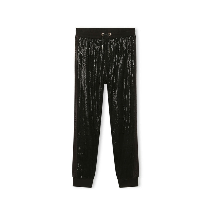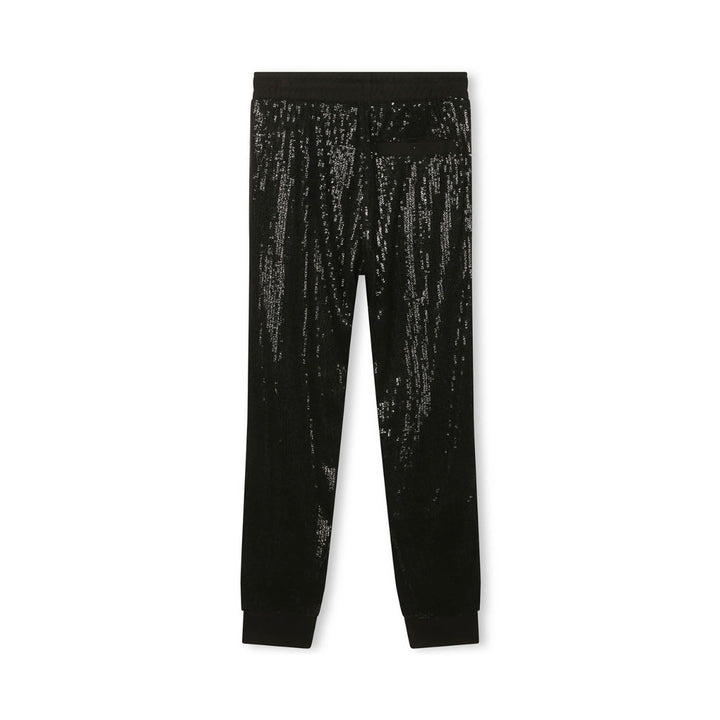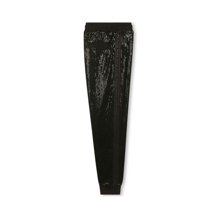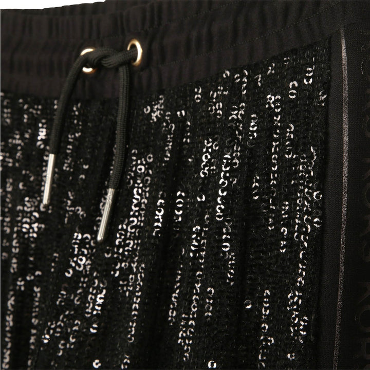 Shimmering with tonal iridescent sequins, these stylish black joggers for girls are by American brand Michael Kors Kids. For a distinctive designer look, these trousers have logo tape trims down the legs, with a gold metal logo plate on the back pocket. Made from soft viscose jersey, they have an elasticated drawstring waist with gold eyelets and embossed end caps.