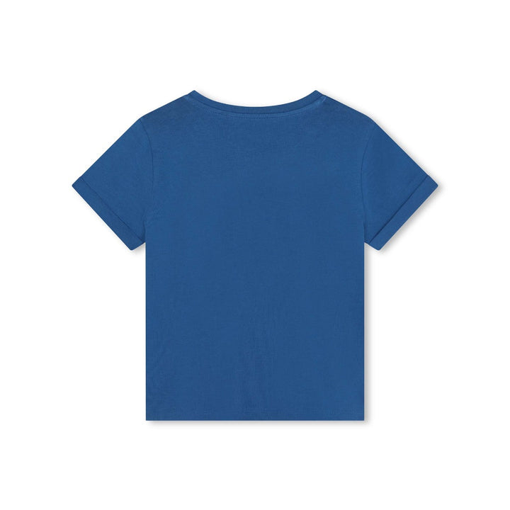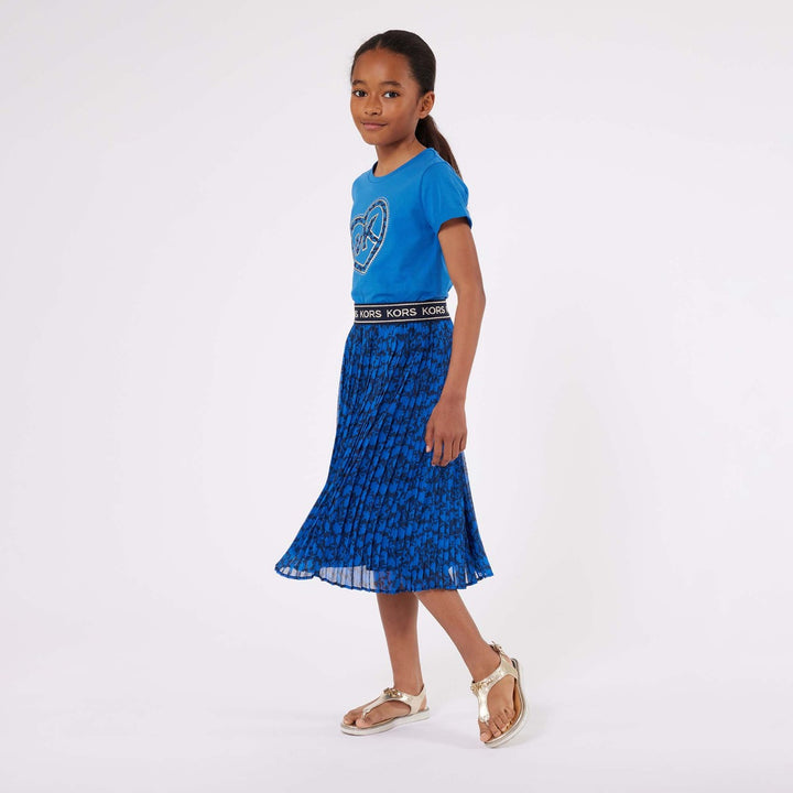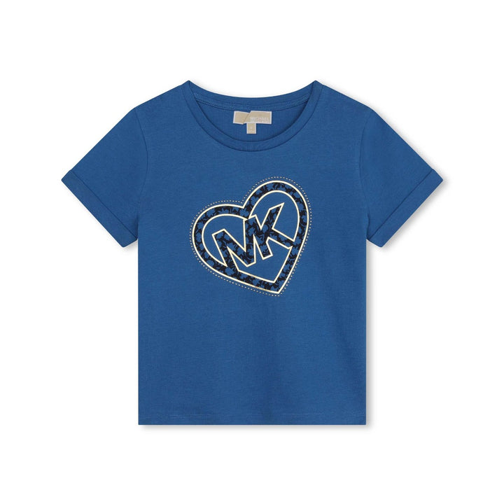 Blue short-sleeved T-shirt for girls by American brand Michael Kors Kids. Unmistakably by the designer, it has a shout-out shiny gold monogram logo printed on the front, within a gold eyelet heart. It is made in soft, comfortable, organic cotton jersey, ideal for casual days.
