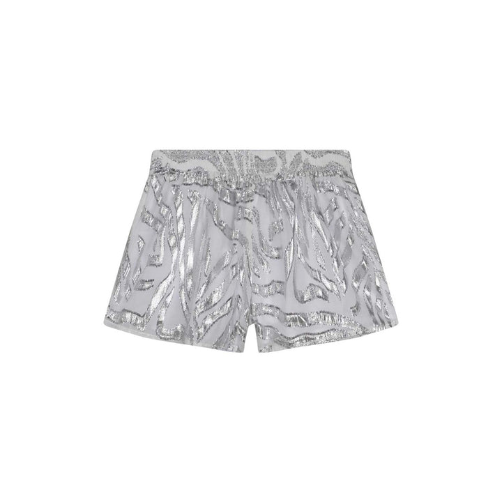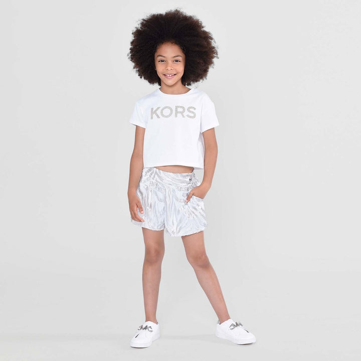 White and silver shorts for girls by luxury designer Michael Kors. Made from soft chiffon, they feature swirls of silver and a silver logo badge on the front. There is a concealed side zip to fasten.