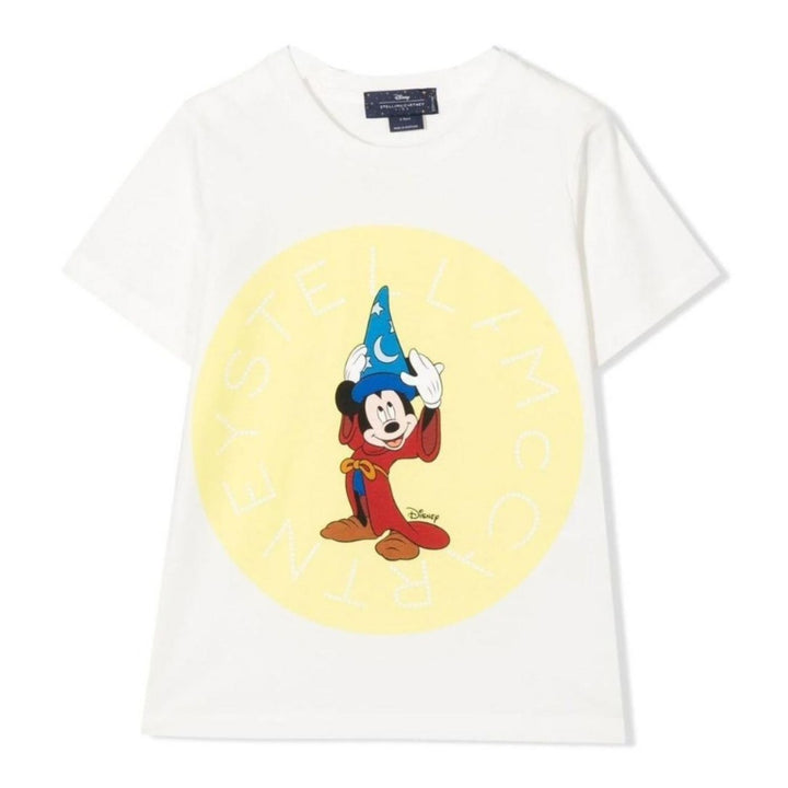 Mickey mouse white t-shirt by Stella Mc Cartney with a half sleeve and a screen printed cartoon in the front. It is a summer wear and has a soft cotton fit.