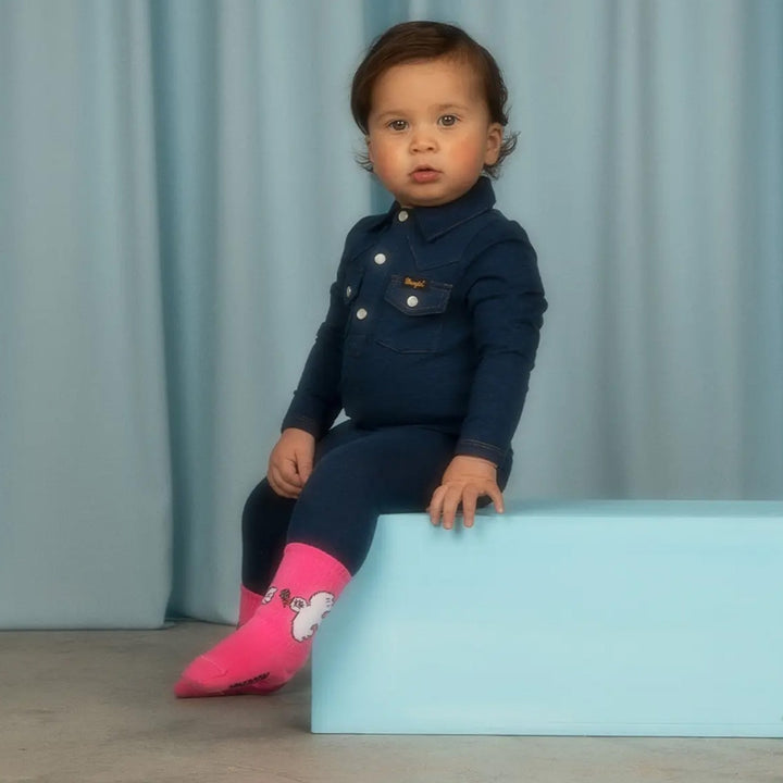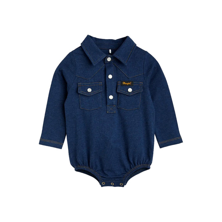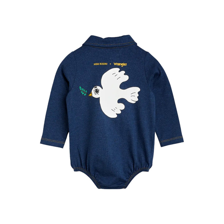 Jersey denim bodysuit with a large Peace Dove print on the back, made from certified organic cotton with stretch. The bodysuit is designed with a classic shirt collar with pearl snap buttons, two front pockets, as well as snap buttons at the crotch for easy dressing.