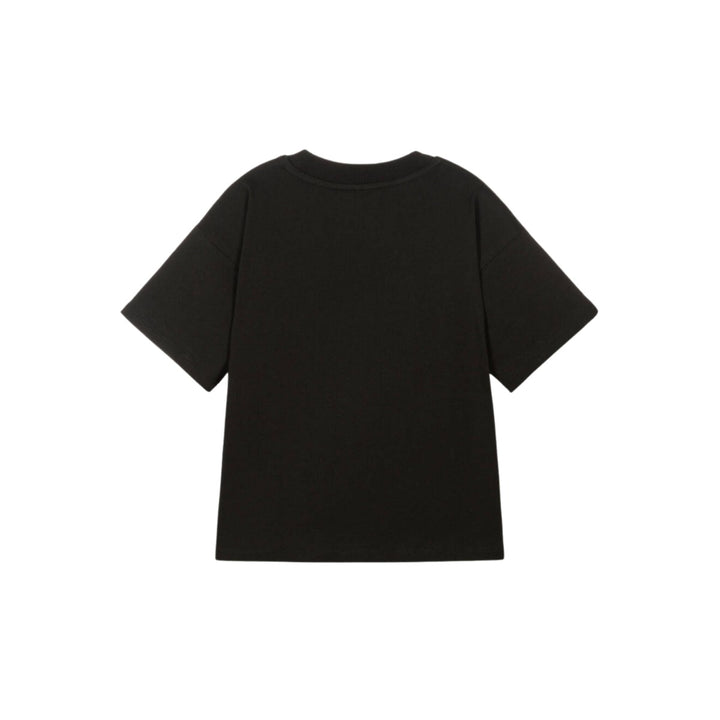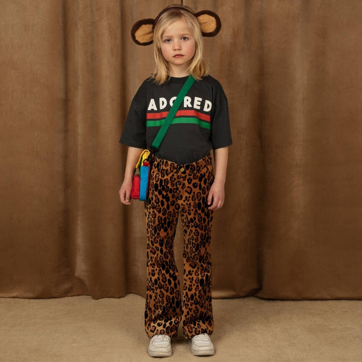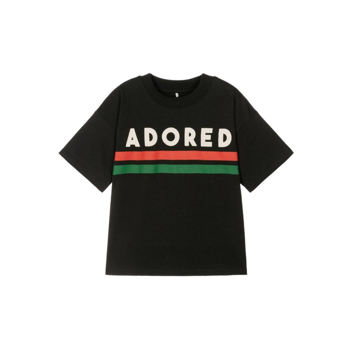 A washed black graphic T-shirt for boys and girls by Swedish brand Mini Rodini, made from soft organic cotton jersey. Fun for casual wear, it has an ivory 'Adored' slogan print with red and green stripes. It has a ribbed crew neck and dropped shoulders with relaxed short sleeves.