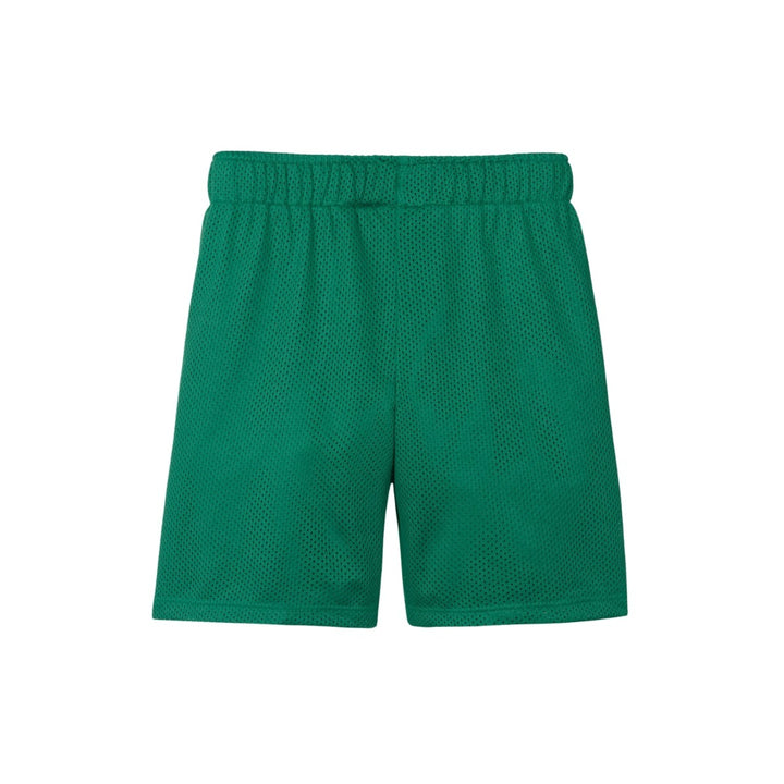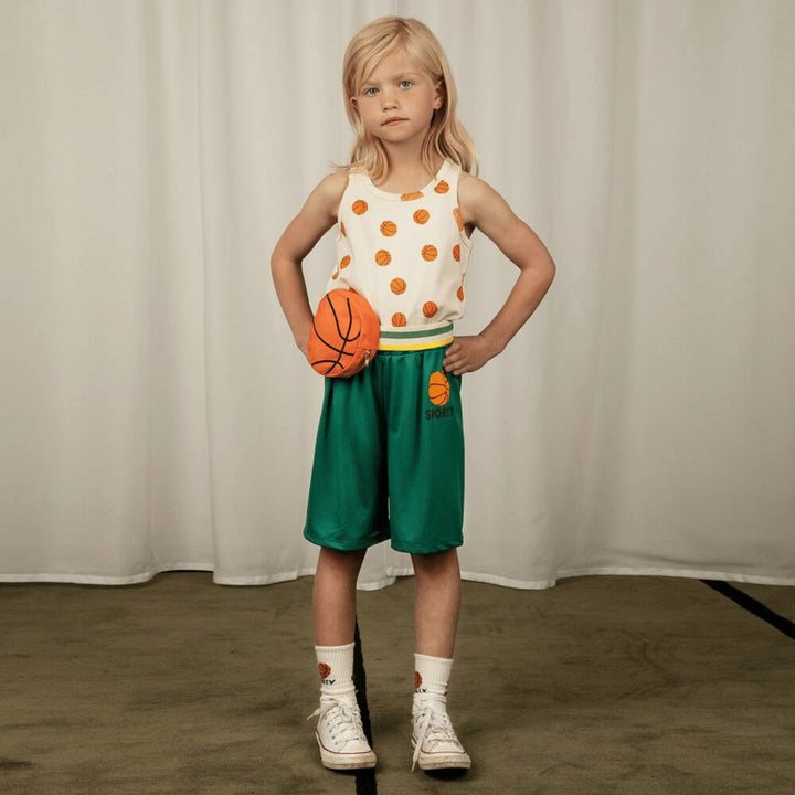 Green shorts for boys by Mini Rodini, made from soft, recycled mesh jersey. Ideal for both sporting activities and casual wear, they have a silky lining for comfort and a stretchy elasticated waistband, with inner drawstring ties ensuring a great fit. A sporty orange basketball print can be seen on the front to complete the look.