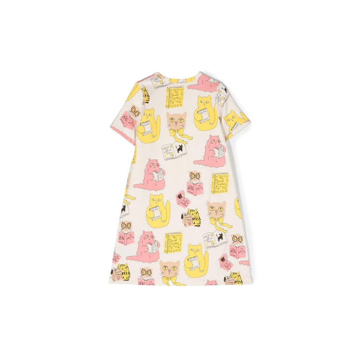 Ivory Cotton Cats & Books Dress from MINI RODINI featuring organic cotton blend, all-over graphic print, pullover design, round neck, short sleeves, above-knee length and beige/multicolour.