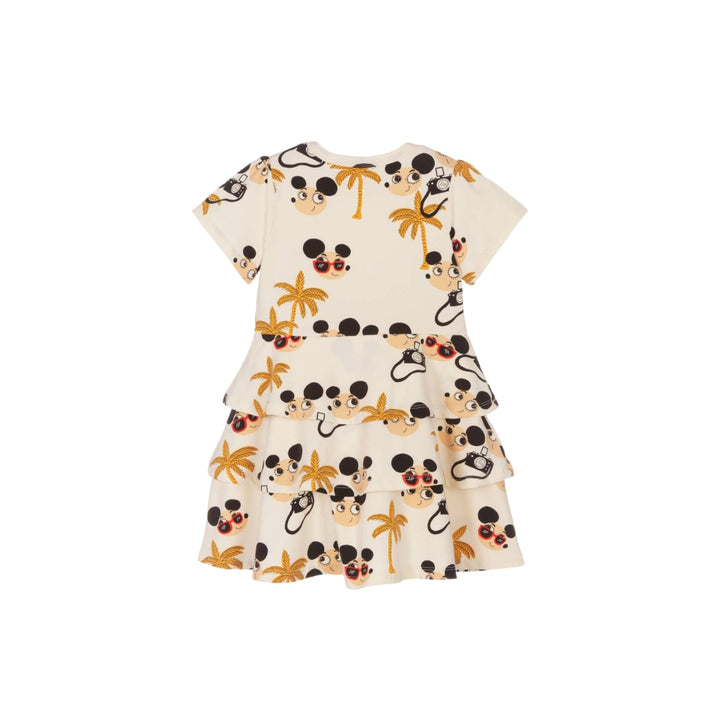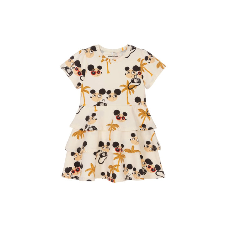 Ritz Ratz organic cotton dress from MINI RODINI featuring multicolour, organic cotton, all-over graphic print, ruffled detailing, round neck, short sleeves and straight hem. Conscious- This product contains organic cotton where the cultivation and manufacturing process restricts the use of chemicals, eliminates pesticides or artificial fertilisers and incorporates methods that respect biodiversity, improve soil quality, and reduce water consumption.