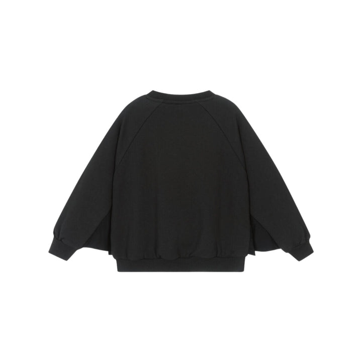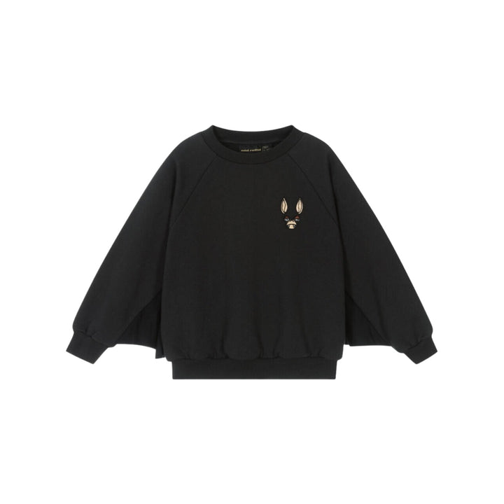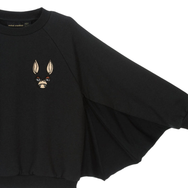 Fun black sweatshirt for girls by Mini Rodini, with batwing inserts between the sleeves and side seams. Made in soft organic cotton sweatshirt jersey, it has casual ribbed trims and a playful bat embroidered on the chest to complete the look.