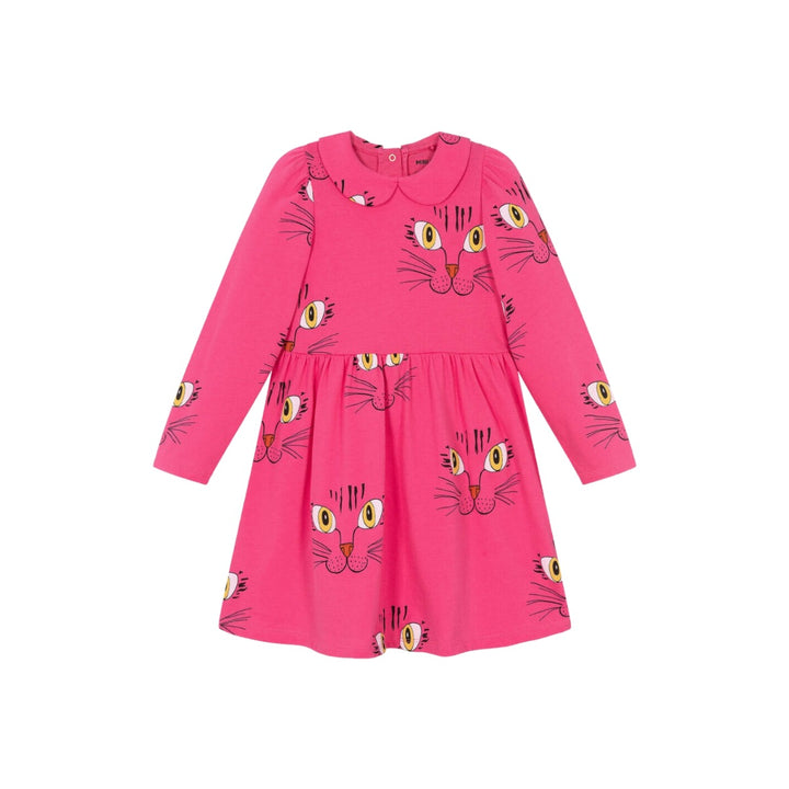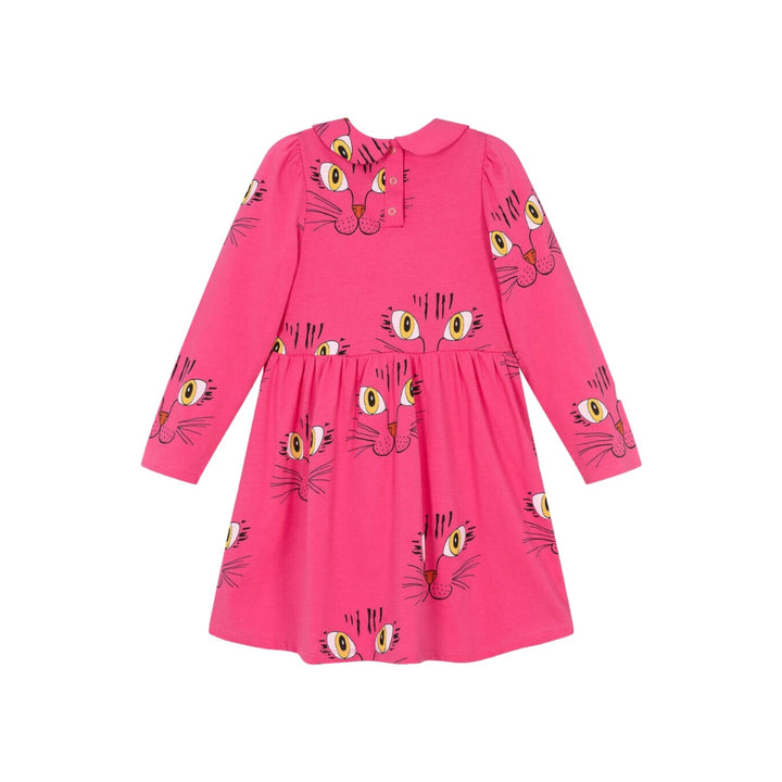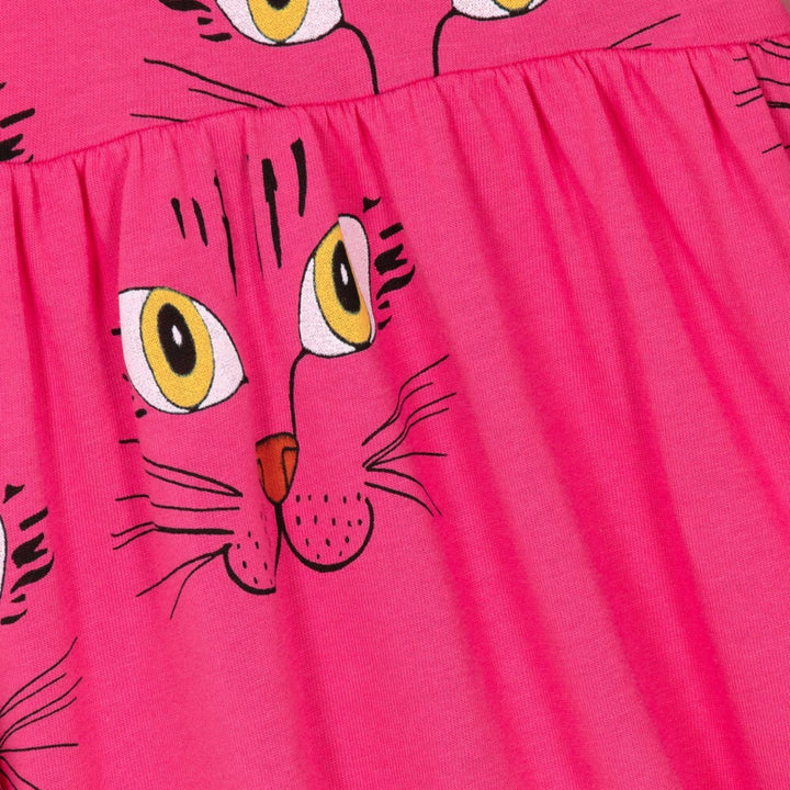 Fun pink dress for girls by Mini Rodini, with a characterful cat face print. Made in beautifully soft organic cotton jersey, this comfortable yet classic style has a sweet rounded collar, gathers on the shoulders and a full gathered skirt. It fastens with easy-to-use poppers on the back.