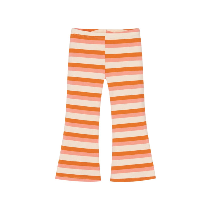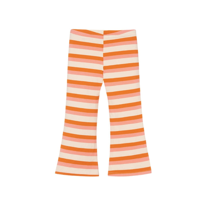 Striped flared leggings for girls by Mini Rodini, in pink, orange and ivory. Made in soft and comfortable organic cotton jersey, they have an elasticated waistband and a gently flared leg.