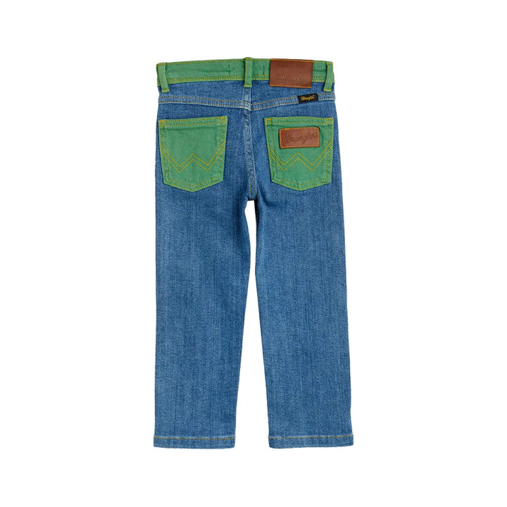 Straight fit jeans made from certified organic cotton with a hint of stretch and an adjustable elastic waist for a great fit. The jeans feature two front pockets and two back pockets with a faux leather Wrangler label, as well as a Mini Rodini x Wrangler label on the waistband.