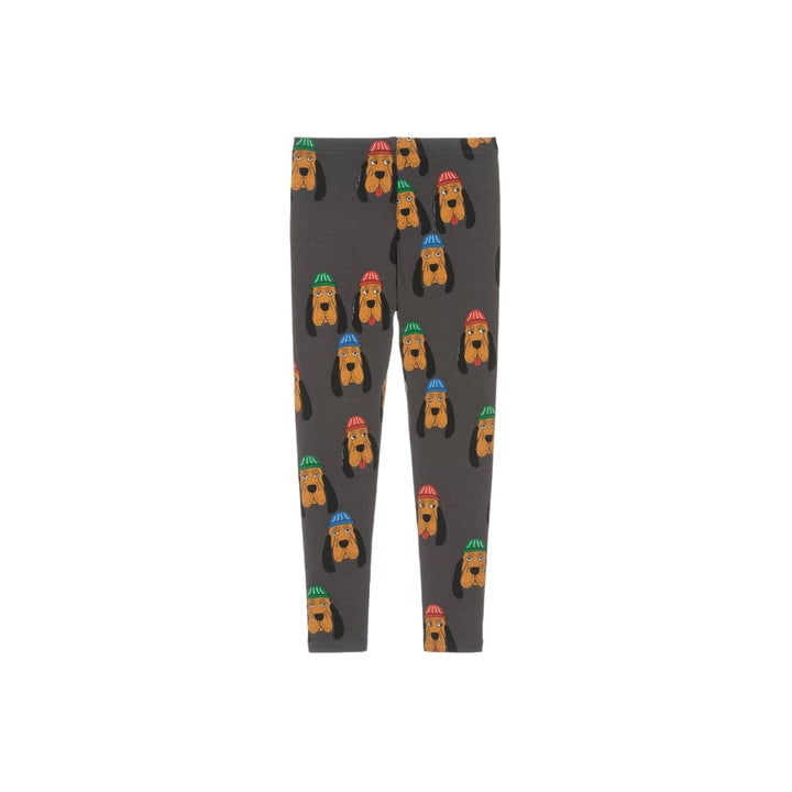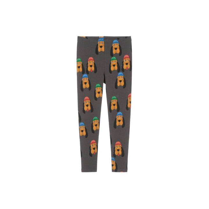 Dark grey leggings for boys and girls by Mini Rodini, made from soft organic cotton jersey. Great for easy dressing, these casual leggings are patterned with brown hound dogs wearing bright red, green and blue hats. They have added stretch and an elasticated waistband for comfortable wear.