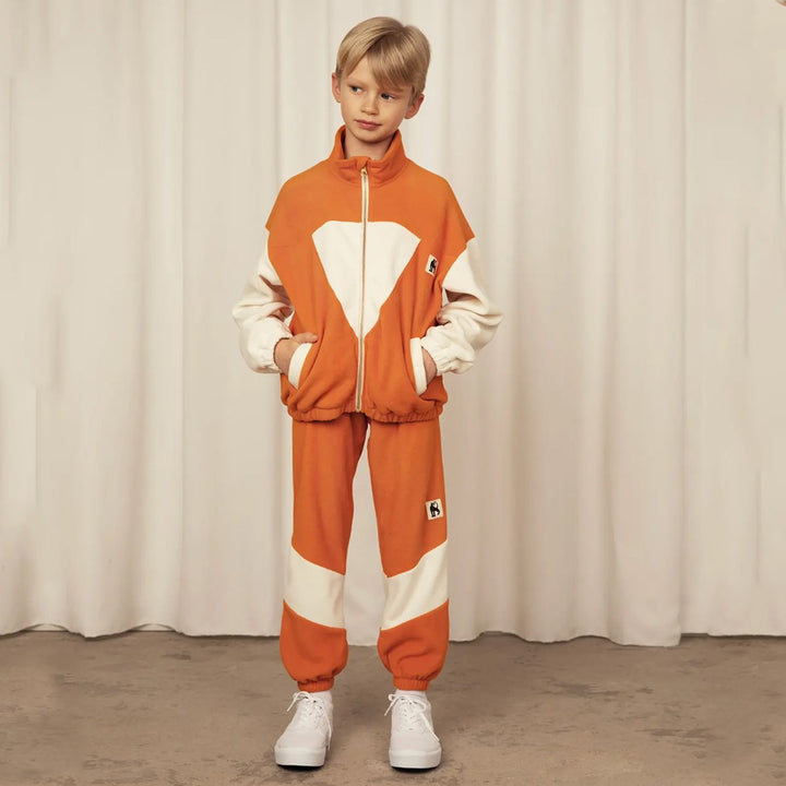 Orange and white fleece trousers made from 100 % recycled polyester. Designed with two side pockets, a fake pocket in the back with a Mini Rodini Panther label sewn on, as well as soft cuffs by the ankles and an elastic drawstring waist.