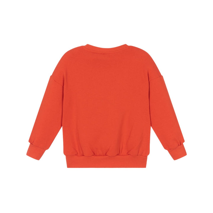 Playful sweatshirt for boys and girls by Mini Rodini, in a vibrant orange-red shade. Made in beautifully soft organic cotton jersey with a cosy fleece feel inside, it has a fun angry cat appliqué on the front in soft beige fleece with embroidered detail.