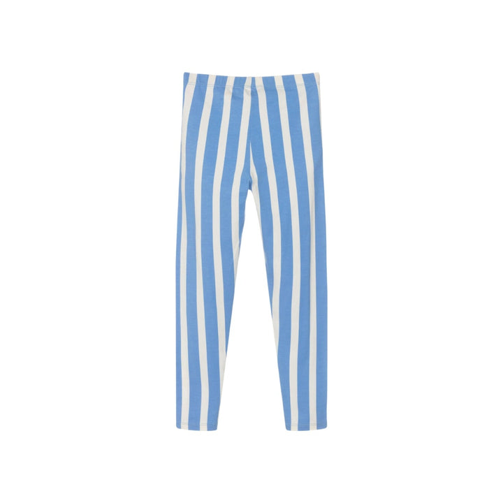White leggings with blue stripes and a Ritzratz print, made from GOTS certified organic cotton with a hint of stretch. Designed with a soft elastic waist.