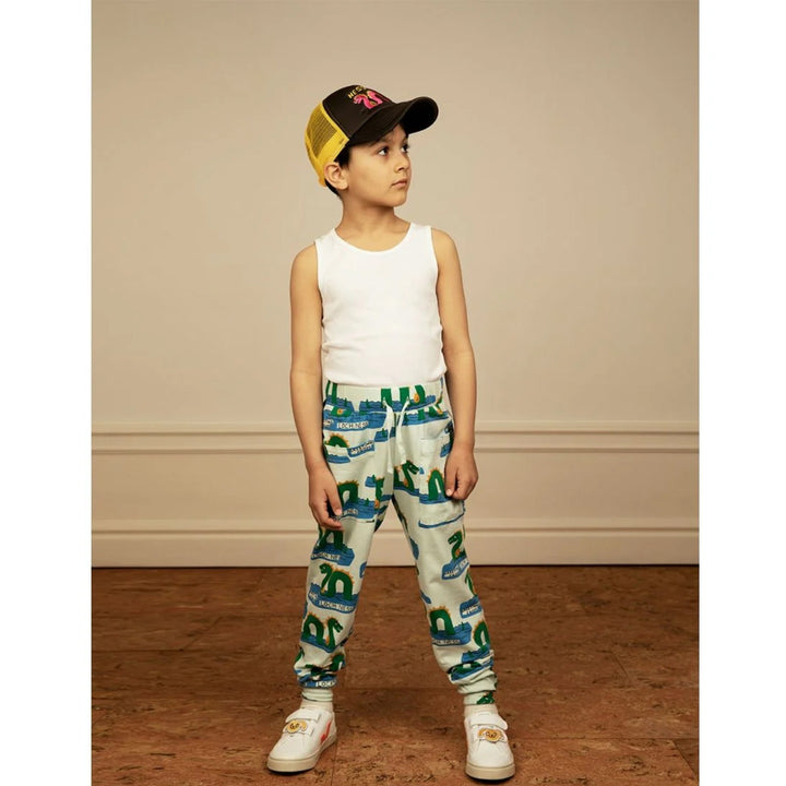 Green trousers with all over Loch Ness print made from GOTS certified organic cotton with stretch. Designed with two front pockets, cuffs and an elastic drawstring waist.