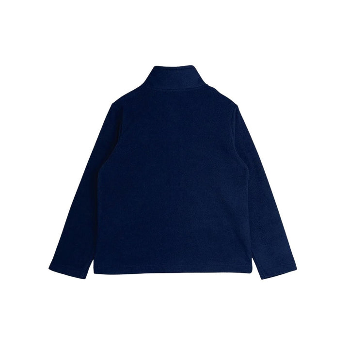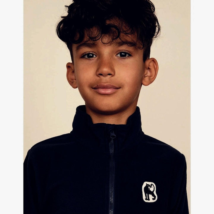 Blue microfleece long sleeve Sweatshirt with a Mini Rodini Panther patch, made from 100 % recycled polyester. The tee is designed with a high neck and a zipper in the front for easy dressing. Perfect for layering under shell jacket on colder days.