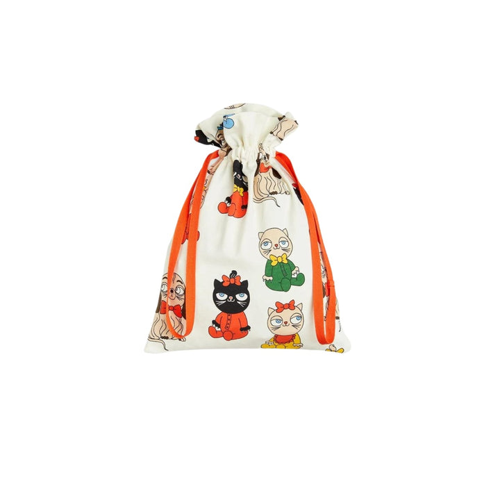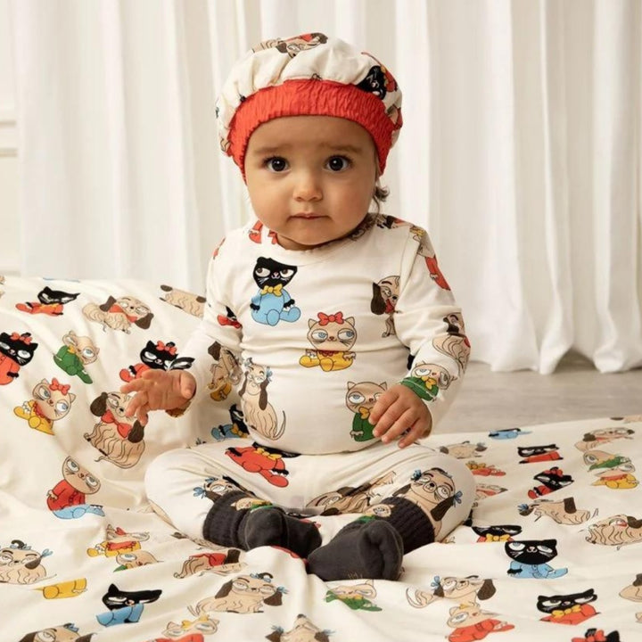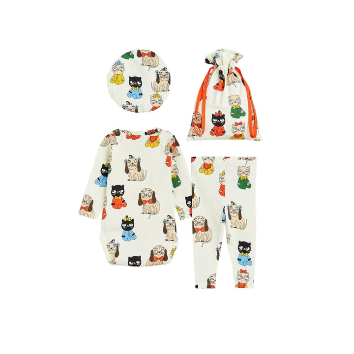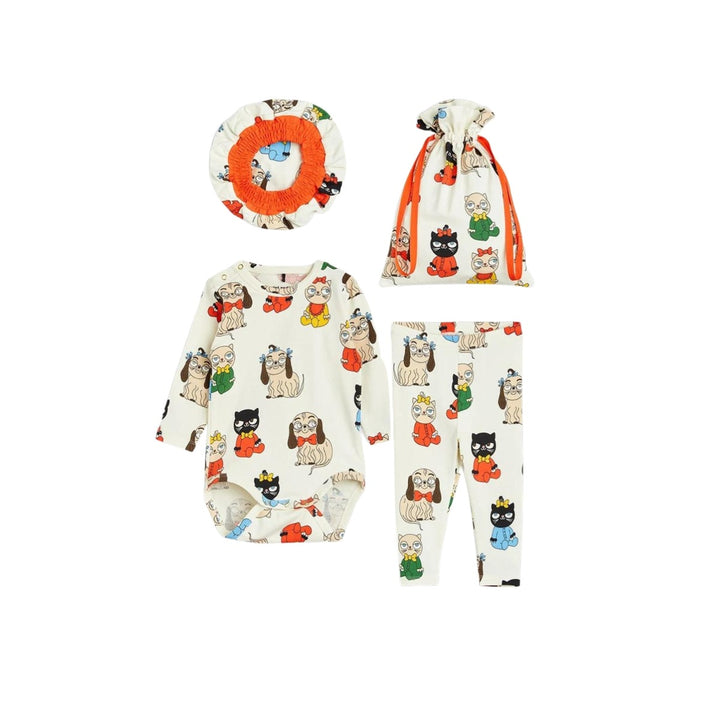 Baby set including a long sleeved body, baby leggings and a hat with all over Mini Babies print, made from GOTS certified organic cotton with stretch. The hat features a soft elastic around the head. The body is designed with snap buttons at the shoulder and crotch for easy dressing. The leggings have a soft elastic waist. The kit comes with a matching drawstring bag.