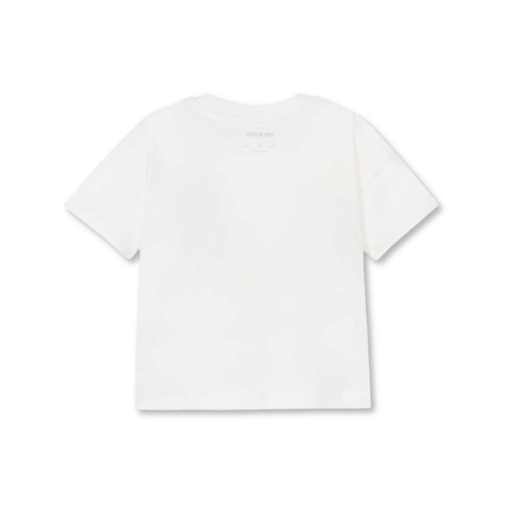 A white short-sleeved T-shirt for boys and girls by Mini Rodini, made from soft organic cotton jersey. For casual styling, it has dropped shoulders and a ribbed crew neck. 'Sporty' is embroidered in black on the chest, with an orange basketball appliqué above made from soft textured bouclé for a fun finish.