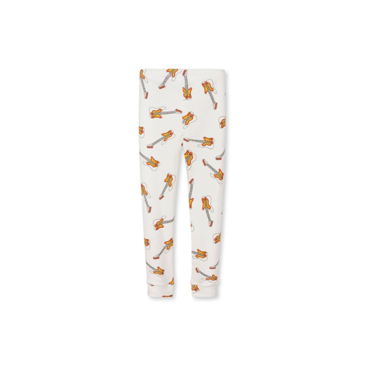 White organic cotton leggings for girls by Mini Rodini, with a fun guitar print in red and yellow. Made in soft jersey, these full-length leggings have lightly ribbed ankle cuffs and a gently elasticated waistband for a comfortable fit.
